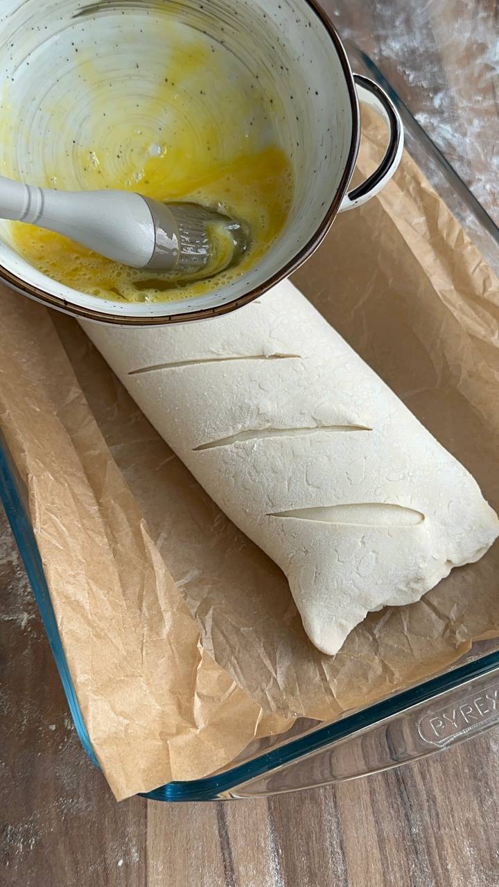 - Сверху смазываем рулет взбитым яйцом