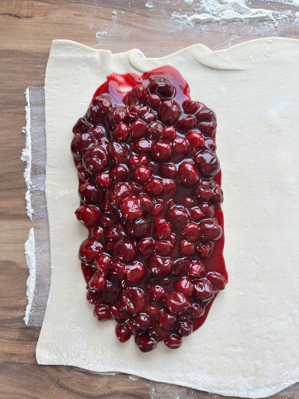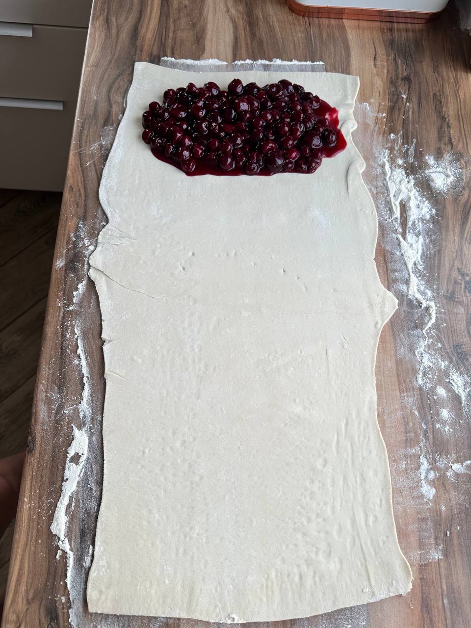 - Выкладываем вишню на тесто и скручиваем рулет